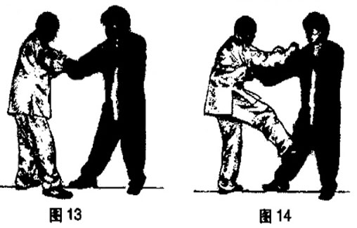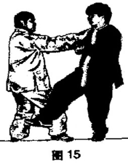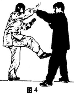 arm, and at the same time, right foot is suddenly kicking opponent's crotch;